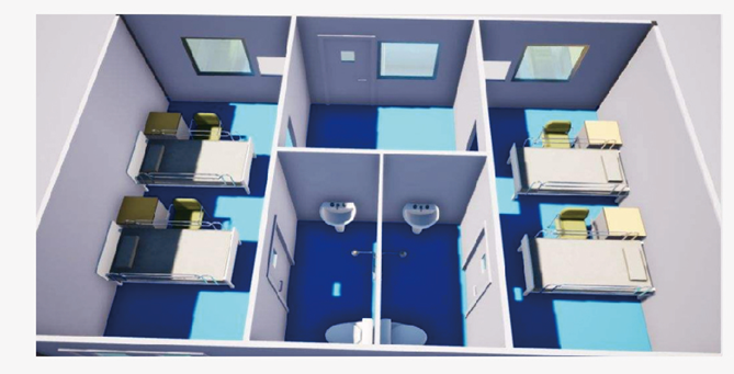 压力梯度是隔离病房各功能区之间的负压递增的程度,是使内走廊、前室和缓冲间、病室、卫生间、更衣间等负压控制区域形成有序的压力差值,负压梯度用来保证空气从低污染区向高污染区流动 。医护人员的通道相对病室和卫生间而言,缓冲间的空气压力相对病室正压一般不小于10Pa。缓冲间内的空气压力相对患者卫生间15Pa,公共治疗区内的空气压力相对缓冲间不小于15Pa,公共治疗区内的空气相对室外不小于10Pa。